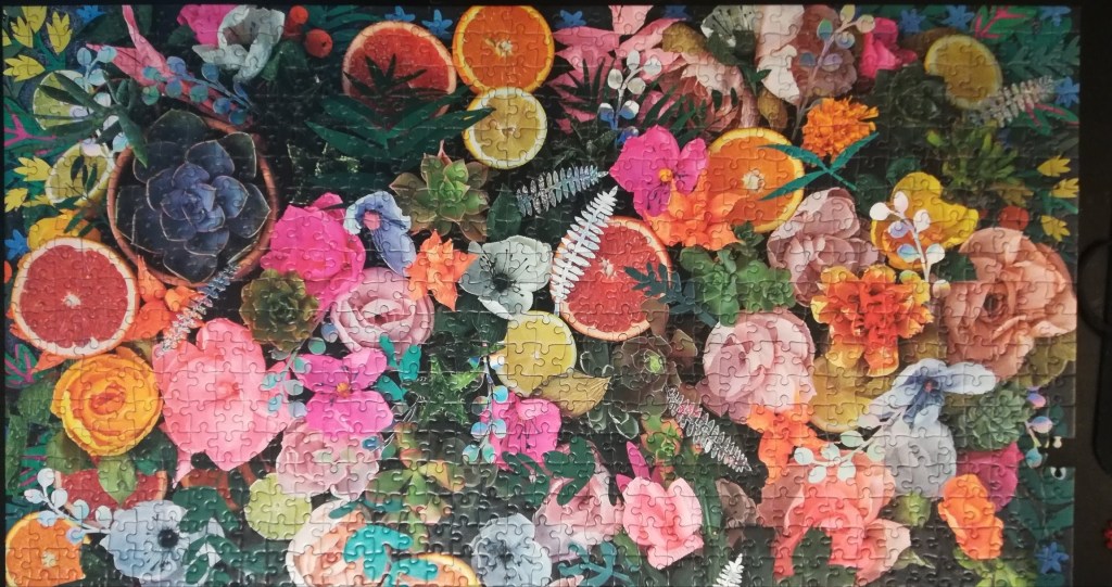 Sitting down on my couch, in front of a large wooden coffee table, I set to work on a new jigsaw puzzle – a vibrant array of colourful flowers interspersed with delightful slices of citrus fruits. The first task at hand is to find all the border pieces, easily distinguishable by their one flat side. In no time at all, a pile forms in the center of the table. As I start to put the pieces together, it becomes apparent that this puzzle, though varied in colour throughout, may not be as easy as it appears. Strings of pieces have formed, but they do not connect and a number of single pieces lay idly beside. The realization comes upon me that I must have put some wrong pieces together. I hunker down, examining each piece more carefully and sift through the box for more side pieces. I am determined to take on the challenge and finish the border before I get up off my couch again.