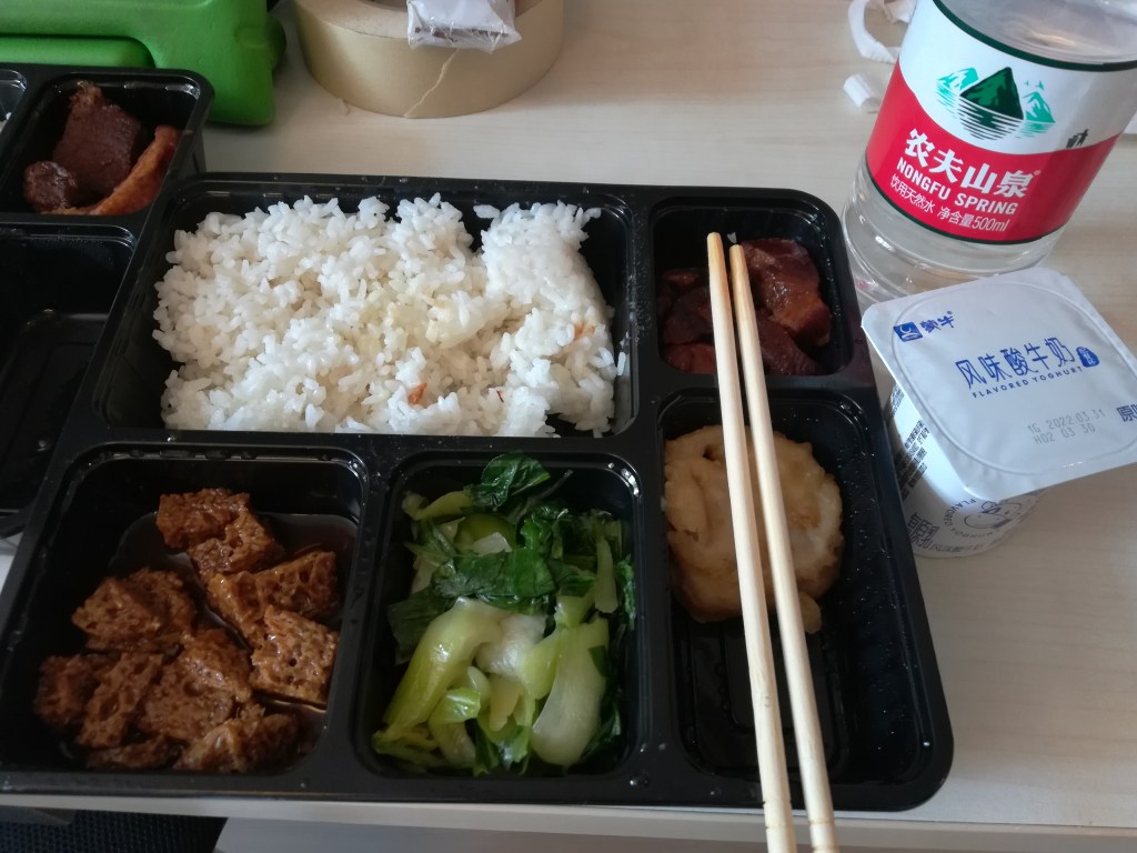 The food is quite similar every day. For breakfast, it has been two steamed buns (a mix of veggie & meat), congee, and a boiled egg. For lunch and dinner, it’s bento box style with rice, assorted stir fried veggies, and some kind of meat (pork belly, pork chops, fried chicken, fish, and even sea cucumber). The sea cucumber is actually the best I’ve ever had! I’m pretty sure they will only serve Chinese food, and my 7 year old son is definitely starting to get tired of the food. I hope we packed enough snacks!