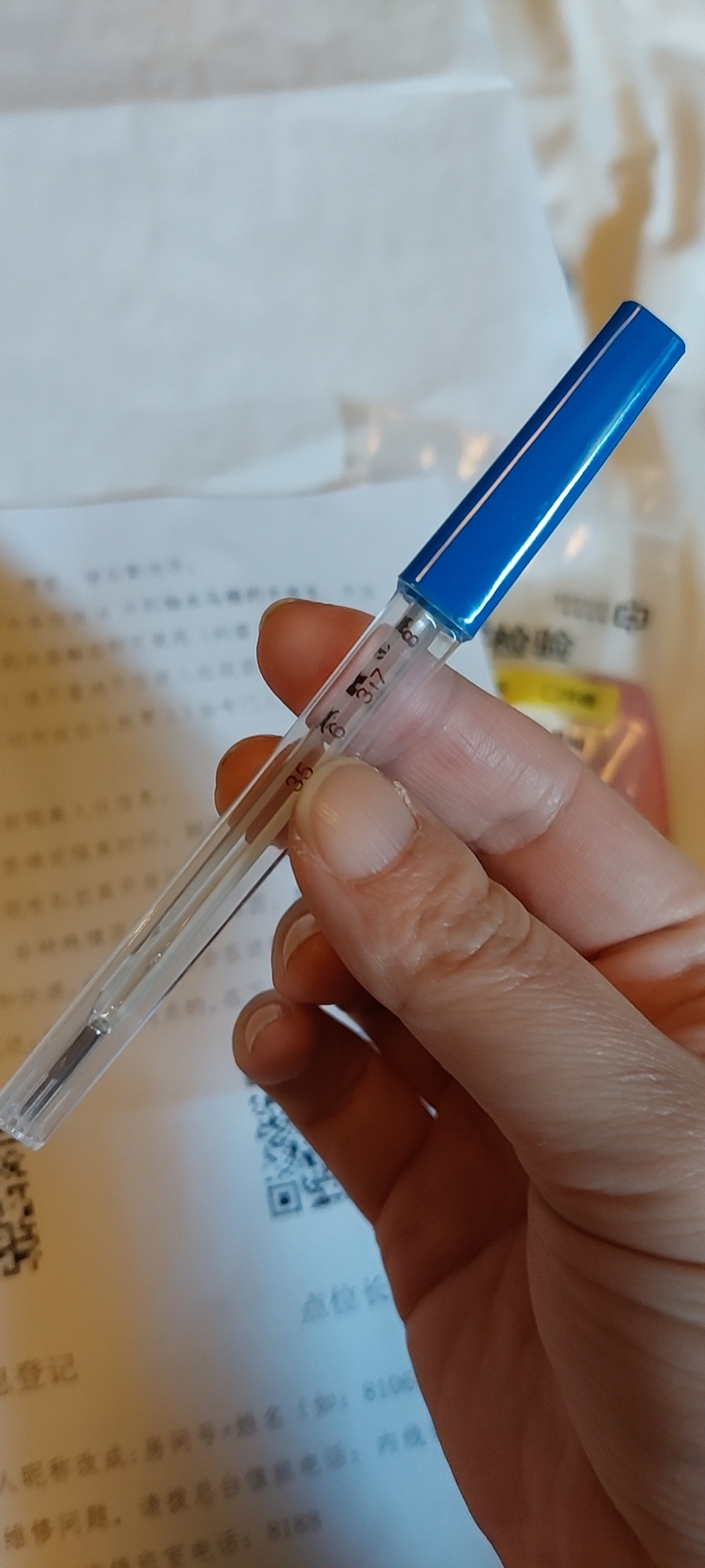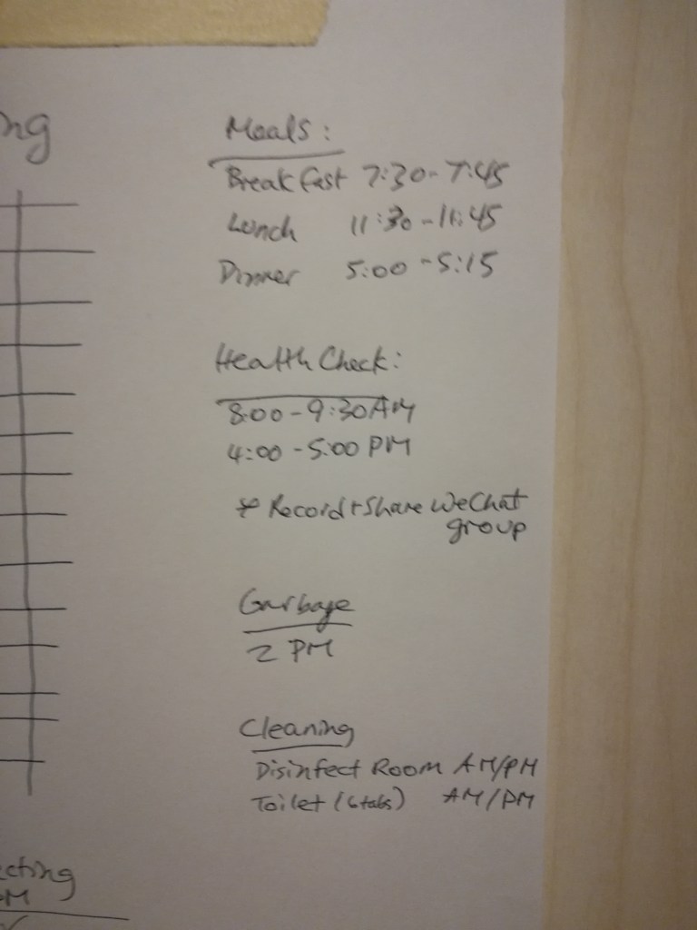 Meals are left outside the door three times a day. No snacks. Sometimes meals have come with a yogurt drink or juice. We have a whole crate of bottled water too. We are to take our own temperature using the supplied mercury thermometer, record it, and share a photo of our record with our quarantine WeChat group twice a day. We are also supposed to disinfect our room with these tiny little cotton balls and put bleach/chemical tablets into the toilet tank twice a day. Garbage is to be left outside your room by 2pm for pick up.