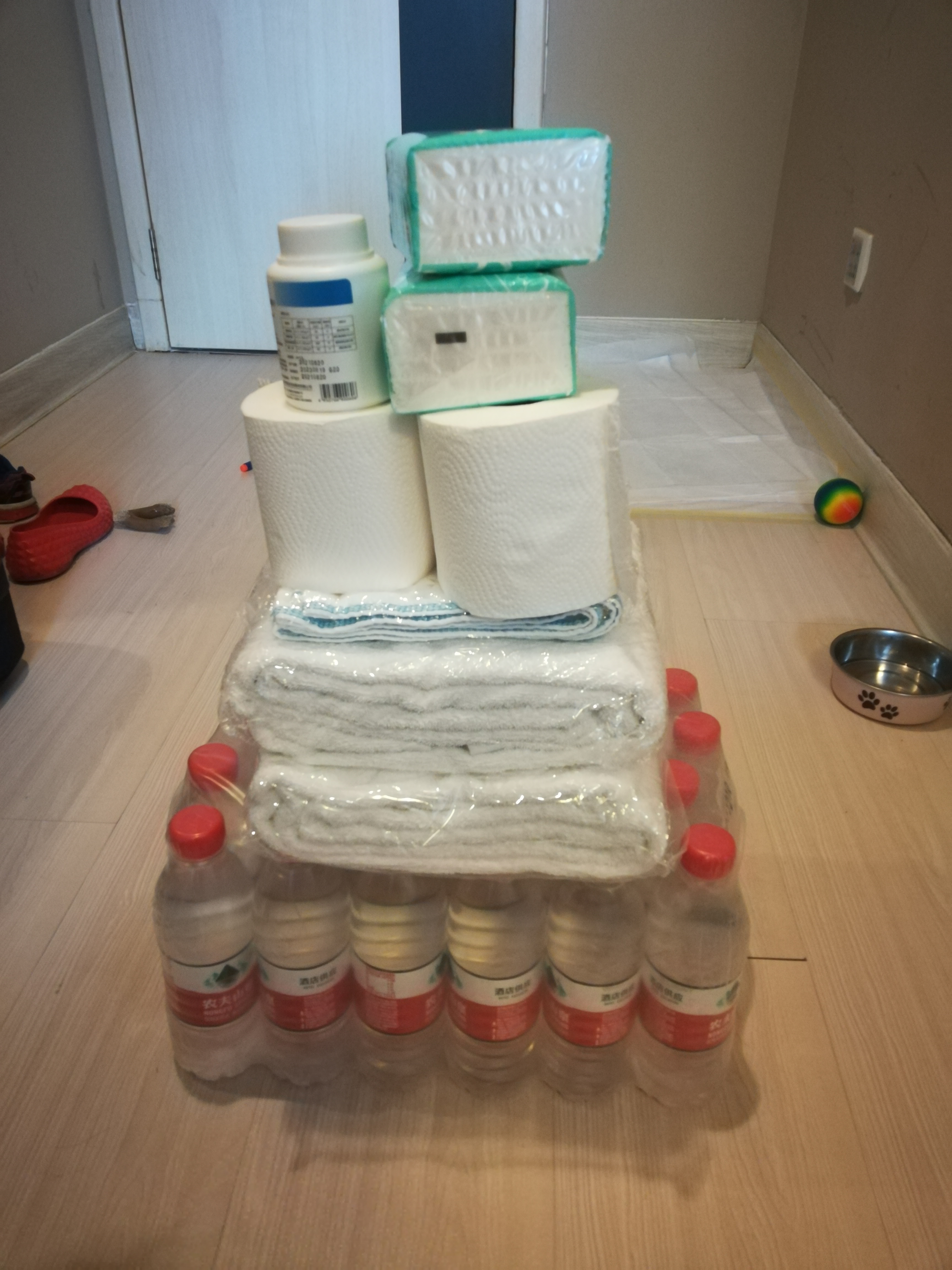 Since we were prepared to not be able to order and receive any kind of deliveries during this citywide lockdown, we brought tons of snacks, dog food, puppy training pads, toys, a drum pad, books, laundry bar soap, kids scissors and tape. My son brought his own pillowcase and nightlight toy. Things I wish we packed would include more wipes, a mini dustpan with brush, shampoo, travel power plug adapter (for my kids’ laptops with the 3 prongs), more paper/construction paper for crafts, and mini speakers for our laptops. They did supply: hand sanitizer, mini disinfecting cotton balls, slippers, towels, toothbrush, toothpaste, liquid all in one shampoo/soap, hair dryer, electric kettle, hangers, trash bags, bottled water, paper cups, tissue paper, a pen and a mercury thermometer. This may vary by hotel though.