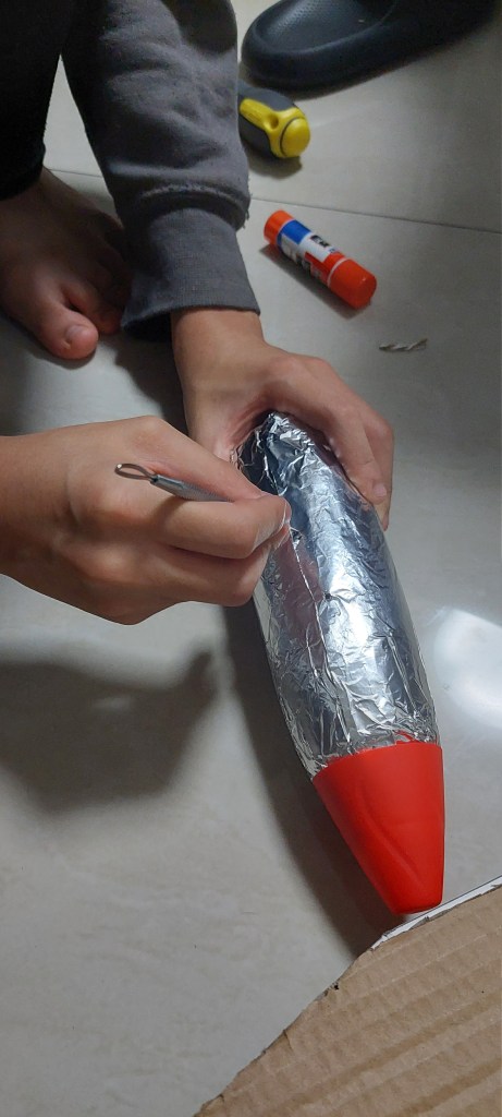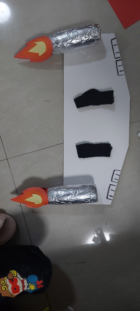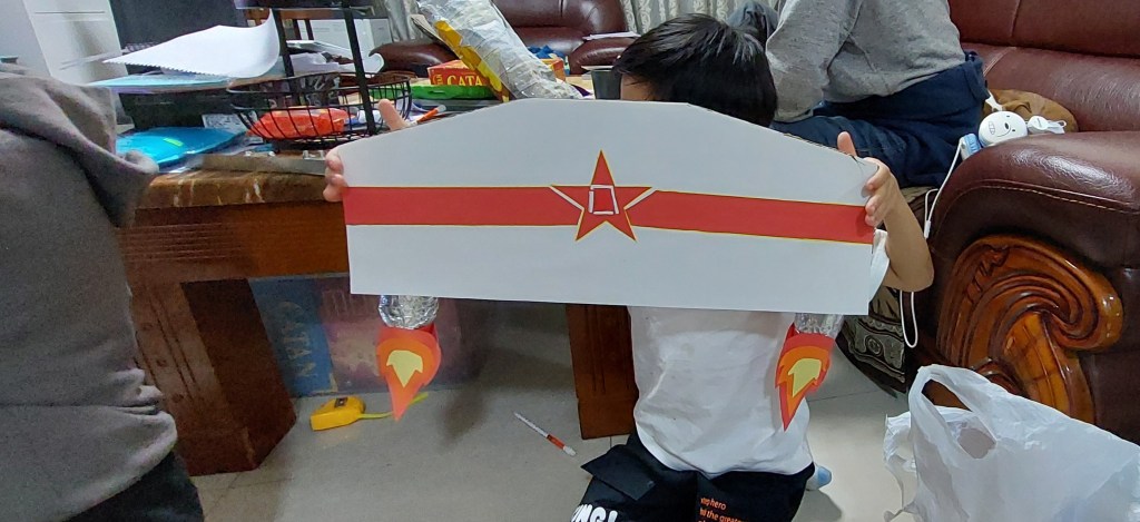 Since one boy had no costume, I enlisted my 13 year old son’s help to make him a costume. This was a great project that my son could get ADST credit for homeschooling. We gave the boy a few costume ideas and he decided that he wanted an airplane costume. My son used poster paper and cardboard to make wings that would be strapped to the boy’s back. Water bottles were transformed into jet engines with aluminum foil. He used orange and yellow construction paper to make the flames that were stapled back to back and fit over the bottom of the water bottles. He looked up the China Air Force symbol and used construction paper to create that on the back side of the wings. The end result was not too shabby.