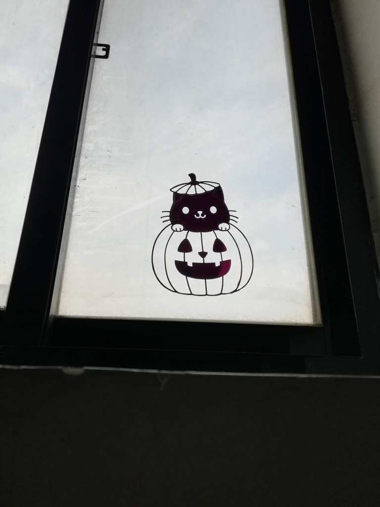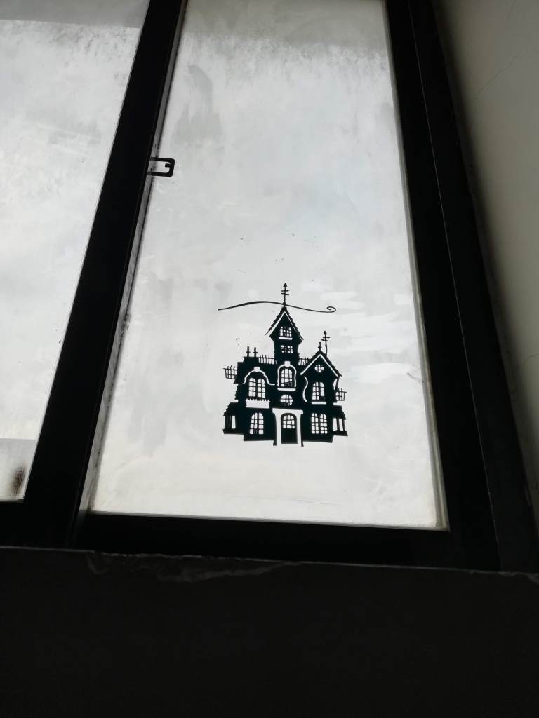 Today we set up our Cricut machine once again, and set to work on some paper window decorations. Our plan was to use our dark apartment building staircase for the “trick or treating.” Each level had a window ledge where we could place some candy. I thought it would be a bit more of a work out for the kids to have to climb up the stairs to get the candy on each level.