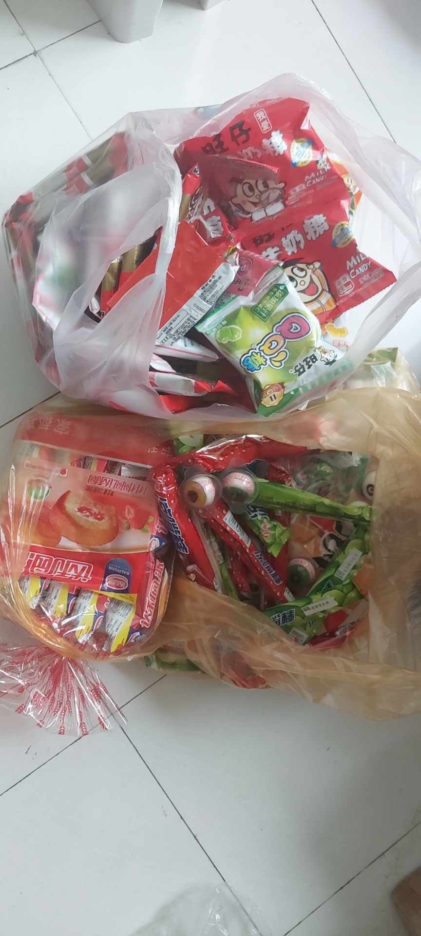 We bought two huge bags of candy at our neighbourhood corner store for approximately 100 RMB ($20 CAD). The assortment included gummies, lollipops, gum, jelly, mini cakes and cookies. They even had these fantastic eye ball gummies, perfect for Halloween!