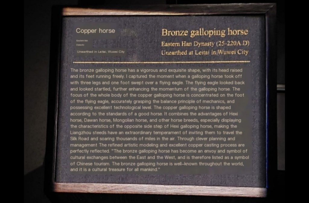 Though I was less than impressed with this plush toy when I first saw it, the actual flying horse artifact inside the museum did leave a deep impression on me. First of all, I love horses, almost more than I love dogs, and only because I revere their great size and strength. The horse figurine itself also had so much character. The mouth was open, as if it were neighing and the whole shape of the body, with its neck turned and legs lifted exuded wild passionate energy. The horse stood with a single hoof on a bird below, with the bird’s head turned back as if it were surprised by something stepping on its back. The fact that this bronze horse, weighing over 7 kilograms, could balance on this small bird underneath it showed skill in craftsmanship.