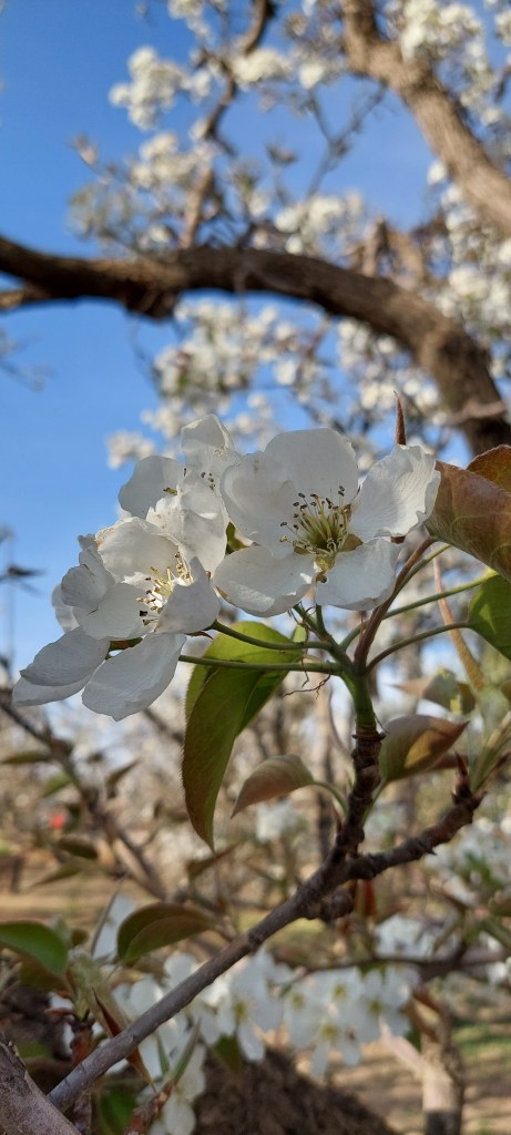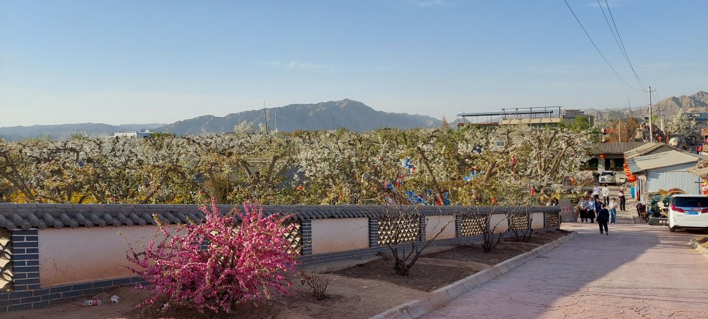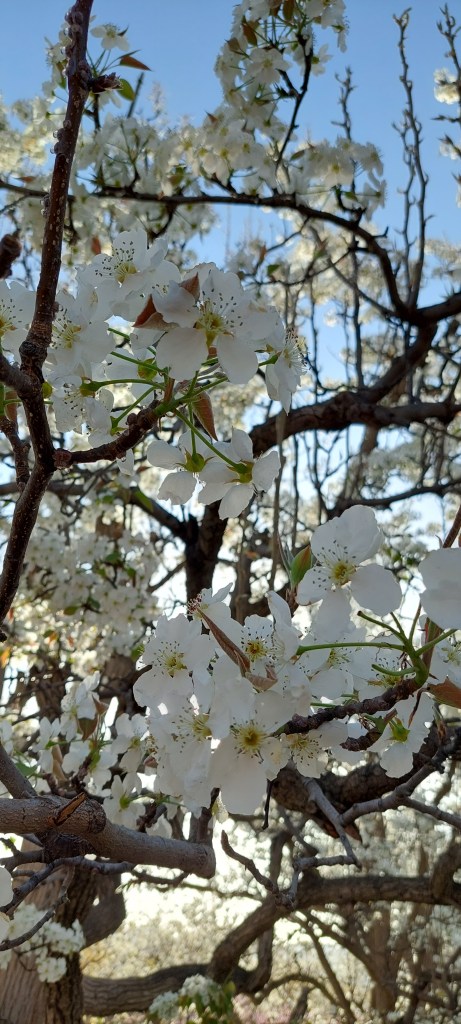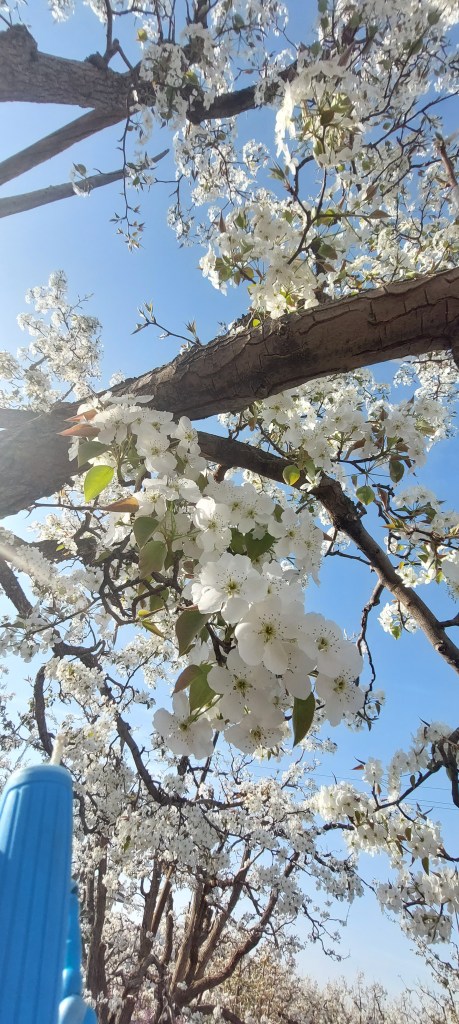 This past weekend, some friends took us to an ancient pear orchard just outside of town. It was so peaceful and relaxing. There are many private gardens where owners set up large tables to offer tea and meals to visitors. Some have bouncy castles, swings or a trampoline for kids to play on. You can literally stay there a whole day if you like and only have to pay for the reasonably priced meal and tea. The trees around us were mostly around 300 years old, but there were older ones as well. Our friend said they could get to around 800 years old. Pears were originally cultivated in China and there is a rich history of pear cultivation along the Yellow River. The dry climate of Gansu province is ideal for growing many things, including pears, apples and peaches.